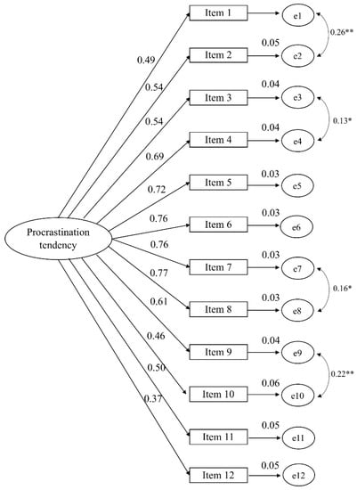 Confirmatory factor analysis (CFA) results for procrastination tendency; all standardized loadings are significant at p < 0.001. * p < 0.05, ** p < 0.001. Model fit indices: χ2 = 318.395, df = 50. p < 0.001, CFI = 0.829, RMSEA = 0.118.
