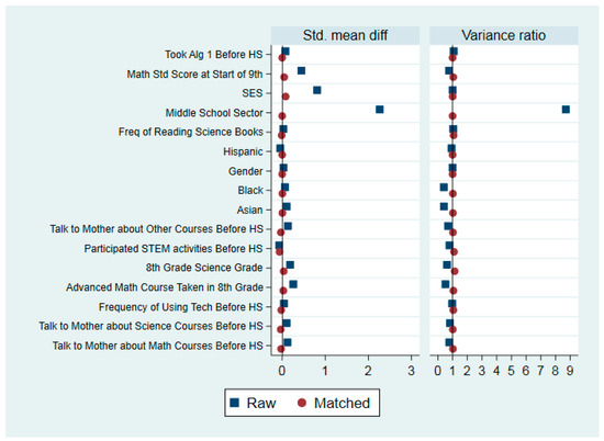 A total of 16 student-level covariates were used for matching to reduce selection bias. Selection factors affecting the likelihood of attending Catholic school include demographic information, prior achievement, features of the learning environment, and family SES. To evaluate the quality of matching, we compared covariates for the raw sample and matched sample in terms of their standardized mean difference and variance ratio. As shown in Table 8, all covariates used for matching are well balanced. Figure 1 provides a visual summary of matching quality.