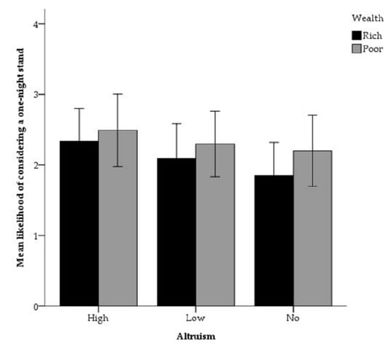 When participants were asked to rate the likelihood of them having a one-night stand with the man in the video (short-term mating), there was no significant difference between the poor (M = 2.33, SD = 1.75) and rich (M = 2.10, SD = 1.56) conditions (F(1, 276) = 1.44, p = 0.231, ηp2 = 0.01) nor across the altruism conditions (F(2, 276) = 1.24, p = 0.290, ηp2 = 0.01) (see Figure 2). There was also no significant interaction between wealth and altruism (F(2, 276) = 0.09, p = 0.918, ηp2 = 0.00).