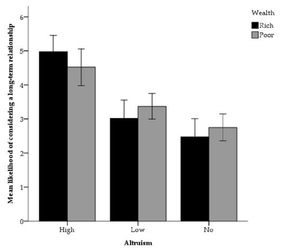 However, when asked how likely they would be to consider a long-term relationship with the man, whilst there was no significant difference between the rich (M = 3.54, SD = 1.97) and poor (M = 3.52, SD = 1.70) conditions (F(1, 275) = 0.09, p = 0.771, ηp2 = 0.00), there was a significant difference across the altruism conditions (F(2, 275) = 43.14, p < 0.001, ηp2 = 0.24) (see Figure 3). A post hoc analysis revealed that participants were more likely to consider a long-term relationship with the actor in the high-cost (M = 4.74, SD = 1.73) than that in the low-cost (M = 3.21, SD = 1.57) altruism condition (p < 0.001, d = 0.93). They were also significantly more likely to consider a long-term relationship with the actor in the high-cost than that in the no (M = 2.63, SD = 1.50) altruism conditions (p < 0.001, d = 1.30) and in the low-cost than in the no altruism conditions (p = 0.036, d = 0.38). This suggests that even non-costly signals of altruism are important in long-term relationships.