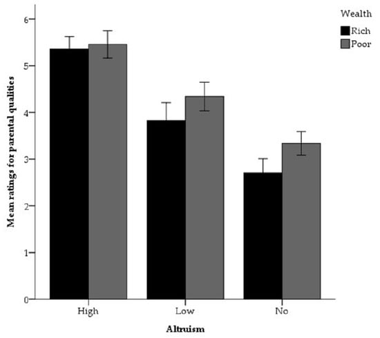 When a 2 (Wealth: Rich vs. Poor) × 3 (Altruism: High-cost vs. Low-cost vs. No) between-measures ANOVA was performed, it was found that the actor was rated higher for parental qualities when he was described as poor (M = 4.35, SD = 1.33) than when he was described as rich (M = 4.02, SD = 1.51) (F(1, 279) = 11.15, p = 0.001, ηp2 = 0.04). In addition, ratings of parental qualities were significantly different across the altruism conditions (F(2, 275) = 131.21, p < 0.001, ηp2 = 0.46). A post hoc analysis revealed that participants rated the actor as having better parental qualities in the high-cost (M = 5.41, SD = 0.95) than in the low-cost (M = 4.11, SD = 1.23) altruism condition (p < 0.001, d = 1.18). They also rated his parental qualities as being significantly higher in the high-cost than in the no (M = 3.06, SD = 0.76) altruism conditions (p < 0.001, d = 2.73) and in the low-cost than in the no altruism conditions (p = 0.036, d = 1.03). This suggests that altruism, even low-cost altruism, is seen as signalling better parenting qualities than no altruism at all (see Figure 4). No interaction was found between displays of altruism and the described level of wealth (F(2, 276) = 1.66, p = 0.19, ηp2 = 0.01).
