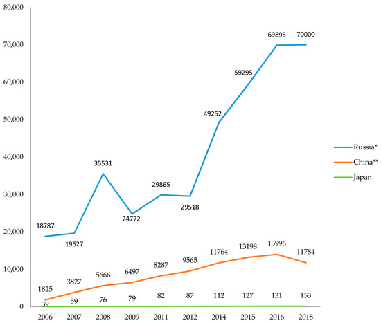 According to UNESCO, in 2017, 84,681 students from Kazakhstan studied abroad (excluding students studying in China), which is 30% more than from Russia, whose population is eight times larger than that of Kazakhstan (142.2 million versus 18.5 million in 2017) (Central Intelligence Agency 2017). If you include the number of students studying in China, a little under 100,000 students from Kazakhstan study abroad annually (Ministry of Education of the People’s Republic of China 2019). The data show that, despite its small population, Kazakhstan is among the top 15 countries sending students abroad (Perna et al. 2015). However, an extremely small number of Kazakhstani students want or can afford to study in Japan, since only about 0.1% of all Kazakhstani students studying abroad choose Japan.