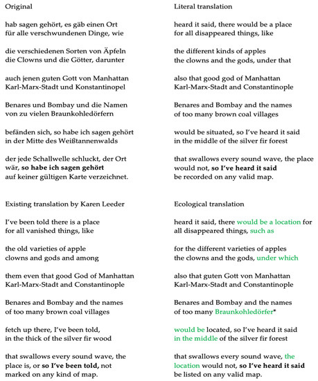 Dr. Karen Leeder’s translation of Sandig’s “so habe ich sagen gehört,” appears not to contain an ecological focus, seeming instead to emphasize word-for-word equivalents and poetic language. As Tymoczko said on translation, a translator must make choices, but when one choice is made another is inherently neglected.48 All ecologically relevant words in my ecotranslation which differ from the non-ecotranslations are highlighted by green text in Figure 1.