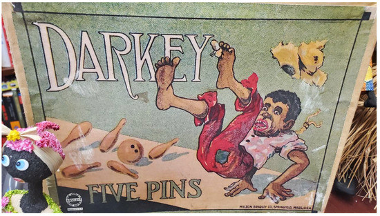 For the past thirty years, these items have supplemented—increasingly rigorously and deliberately—my teaching of and public presentations on African American literature and culture. They have invigorated ideas and discussions, breathing life into the texts I teach. Among my assorted and-in-no-particular-order-of-collecting-or-importance collection are minstrel dolls; a Mattel 1950s toy clock and toy television with only white people pictured; Barbie dolls in various skin shades, and a couple of Barbies—one Black and another white-in wheelchairs; a brown-skinned American Girl doll my spouse and I bought based on the marketing promise that the doll would look like our biracial daughter—it did not and seemed but another white doll mold, with dark hair added, and brown “skin”; a bowling game (pictured above) in which the object is to roll a ball into Black children to knock them down to score points (Figure 1); another game that involves competing players throwing bean bags into Black minstrel mouth holes; postcards of alligators chasing Black adults and children; minstrelsy posters; a Black lawn jockey with a monkey-like face, painted white; a bushel-basket-size Mammy figure; a miniature Mammy lamp and cookie jar; multiple “ethnic” Nativity scenes; a Parisian Chef clock that offers an interesting contrast to one that looks like “Uncle Ben”; “Darkie” and “Black Girl” toothpaste from Sichuan, China; a music box with a Black ballerina; a box of “Obama Waffles” mix sold at the 2008 Family Research Council’s Values Voter Summit in Washington, DC; Jim Crow signage; Spain’s “Conguitos” chocolate candy pieces, and wrappers featuring a minstrel-like cartoon figure. The occasion of this essay exercise has prompted me to take on the task of inventorying more formally my collection in terms of what each items is, where it was manufactured, its general popularity, and any other notes that one might find in other museums and libraries. For now, though, they are catalogued in my memory and rely solely on my own personal curation.