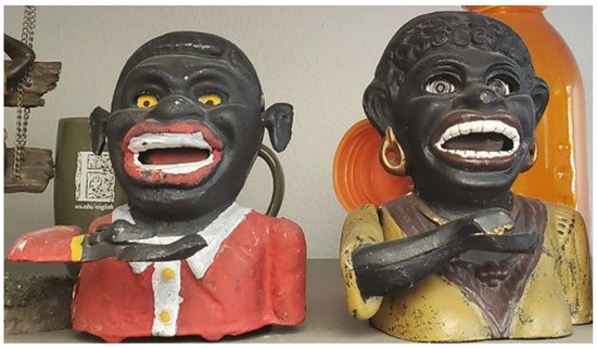 Since these stereotypes have also been reinforced by literary and filmic representations of Black folks, my collected artifacts complement my teaching of nineteenth-century slave/bondage narratives like Frederick Douglass’s Narrative of the Life of Frederick Douglass, an American Slave (Douglass [1845] 1996) and Harriet Wilson’s novel Our Nig (Wilson 1859); of twentieth-century novels and plays, including Zora Neale Hurston’s Their Eyes Were Watching God (Hurston 1937), James Baldwin’s Blues for Mister Charlie (Baldwin 1964), and Toni Morrison’s The Bluest Eye (Morrison 1970); and of film into the twenty-first century, such as Spike Lee’s Bamboozled (Lee 2000). Sterling A. Brown (1933), in his essay “Negro Character as Seen by White Authors,” identifies categories of stereotypes that manifest in textual and material creations: the contented slave, the wretched freeman, the comic Negro, the brute Negro, the tragic mulatto, the local color Negro, and the exotic primitive (p. 180). Pieces in my collection both embody the perpetuation of these reductive stereotypes and, as they serve as teaching tools, challenge these misrepresentations. Dr. Michelle Pinkard, a Black former graduate student mentee who is now an Associate Professor of English and interim chair of the Department of Languages, Literature, and Philosophy at Tennessee State University, recalls the immediate intellectual and cultural connections she made between her previous experiences at the historically Black colleges and universities (HBCUs) she attended and her seeing my office at Arizona State University for the first time: