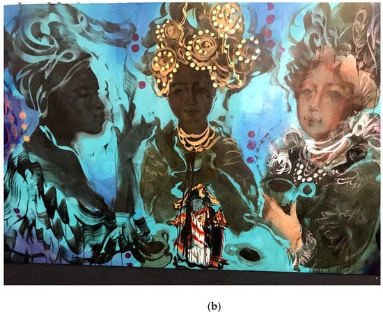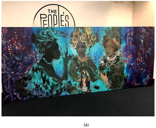 Against the backdrop of Manhattan’s Garment District, in the heart of New York City, resides The People’s Forum, a “movement incubator for working class and marginalized communities.” Established in 2018, The People’s Forum serves as an educational and cultural center, promoting grassroots activism and providing a space for casual convenings in the café the occupies the Forum’s first floor. The People’s Café, as its name suggests, promises a meeting space for the free exchange of knowledge, ideas, and arts, accessible to all in a city where access often comes at a premium. Hanging along the café wall, García’s impressive portable mural, Blame … Coffee (Figure 1a,b), greets patrons with a grandiose scene of women imbibing both coffee and conversation. Commissioned in 2019 specifically for the café and library of The People’s Forum, García’s painting serves to amplify the visual and historical aura of women, immigrants, and people of color within the context of a site of unfettered access and mobilization for underrepresented communities in New York.1 As an Afro-Latinx artist born and raised in Santo Domingo, Dominican Republic, and a long-time resident of New York, García’s personal history and heritage resonates with the mural’s revisionist intent and itinerant (portable) medium.
