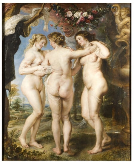Peter Paul Rubens, The Three Graces, 1630–1635. Oil on oak panel, 87 × 71 in. Image in public domain.