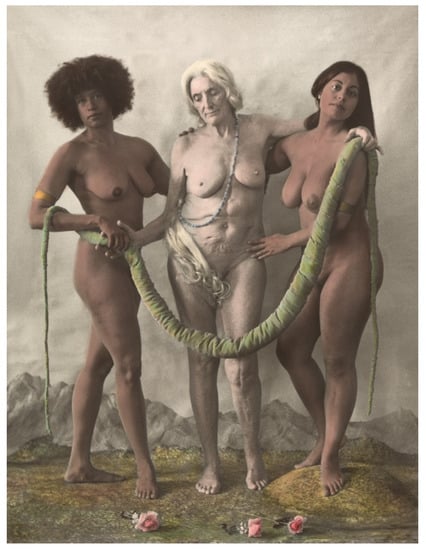 Like García, British curator, photographer, and filmmaker Leah Gordon (b. 1959) often explores transatlantic dynamics through historical entanglements between Europe and Hispaniola. In Gordon’s words, “The turbulences of the epochal capitalist accumulations of the 18th and 19th centuries help me to gather an internationalist understanding of where we find ourselves in the 21st century” (artist website, http://www.leahgordon.co.uk (accessed on 21 February 2021)). Gordon best visualizes this dynamic in her digital photograph Europe Supported by Africa and the Americas—A Prophesy (2014; Figure 4). The composition conceptually and formally parallels García’s mural, in which three women who, as the title suggests, embody distinct continents and races—an African woman at left, a European woman at center, and a Native American at right—capture the viewer’s gaze. As is generally true of Gordon’s oeuvre, the figures feel at once out of time and imminently present. The three women connect to each other through compassionate gestures, the woman at right gently grasping the central figure’s waist, the central figure reaching out to hold the hand of the woman at left. While serene at first glance, the image’s uncanny details slowly give way to a scene rife with cynicism and artificiality. These women do not operate in concerted grace, but rather stand dutifully bound to one another through the bonds of coloniality.