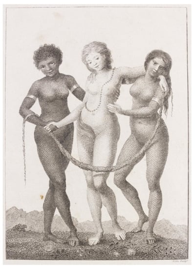 Gordon’s composition directly references the widely circulated 1796 engraving of the same title by British artist William Blake (1757–1827; Figure 5), who produced the work as an allegorical repudiation of enslavement in the then-Dutch colony of Suriname. Blake’s image shows the allegorical figures in the tradition of The Four Continents, an early-modern practice of visualizing and imagining Africa, Europe, the Americas, and Asia as embodied female forms who epitomized emergent globalization of the time. Gordon reimagines Blake’s original commentary through the jarring transformation of Europe, at center, from her supple, youthful form to an elderly woman now reliant upon the flanking figures of Africa and America to help her stand. Gordon’s work thus dialogues with García’s through their shared efforts to critique the modern/colonial gender system by way of relationality (vincularidad)—relationality between past and present representations in the art historical record; relationality of the female figures within the composition; and the geopolitical relationality among the continents these allegories signify.