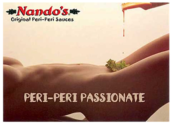 Women as literal food, Nando’s advertisement, 2015. Chiowama—Beauty Blogger, http://chiowamabailey.blogspot.com/2011/02/my-top-5-fast-food-restaurants.html (accessed on 10 December 2020).
