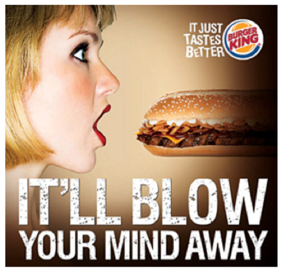 Women as heterosexualized, implicitly swallowed, swallowers of meat. Burger King advertisement, 2014. https://heyhowsitgoin.wordpress.com/2012/01/20/pictures-of-women-depicted-negatively/ (accessed on 10 December 2020).