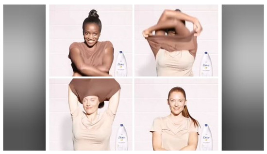 Racist context for food injustice. Social Media advertisement for Dove Body Wash, 2017. The ad caused a furor and was featured in numerous tweets, internet articles, posts, and podcasts, including: https://www.nydailynews.com/entertainment/tv/dove-model-racist-ad-not-victim-article-1.3556259; http://myspice.tv/dove-suffers-backlash-over-racist-ad/; https://www.socialsamosa.com/2017/10/dove-racist-ad-furore/; https://www.thealternativedaily.com/dove-apologizes-for-controversial-body-wash-ad/ (all accessed on 10 December 2020) Dove apologized for the racist implications of the ad, which a spokesperson said were unintentional. However, the company’s lack of awareness is part of the problem of racism in the U.S. The Black model said she had no idea how her pictures would be used.