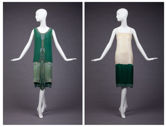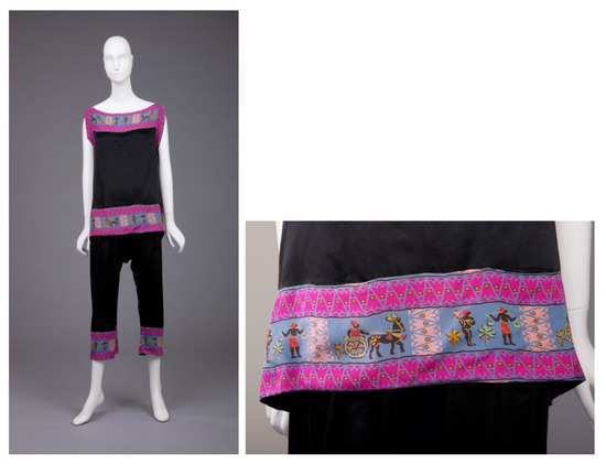 First, let us consider the Callot Soeurs gown (Figure 1). For twenty-first century viewers, the Egyptian aspects of the gown may be somewhat challenging to detect at first glance, while the silk pajamas are rather straightforward (the Pharaoh’s distinctive crown is easily recognizable). The French luxury designers the Callot Soeurs were well known for incorporating “oriental” motifs in their designs (Lee 2016, p. 52). As Caroline Rennolds Milbank notes, in Couture: The Great Designers, the designers’ use of intricate embroidery techniques, tunic forms and choice of colors—from “kingfisher blue and black” to “Nile green satin”—all contributed to a popular orientalist aesthetic (Milbank 1985, p. 63). Founded by four sisters in 1895 in France, by the 1920s the fashion house had expanded and opened branches in Nice, Buenos Aires and London, attracting a following by elite society ladies (Dirix 2016, p. 68). By the mid-1920s, all major New York City department stores sold Callot Soeurs designs including Bonwit Teller and Co., B. Altman & Co. and Saks Fifth Avenue (Weinberg 2015, p. 15).
