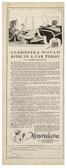 Similarly, a Mineralava beauty clay advertisement implies Cleopatra’s whiteness through her flawless complexion, while also presenting her as a modern woman (Figure 4). Asserting that Cleopatra, “the beautiful, the magnificent,” would ride in a car today if given the chance, the advertisement concludes that modern Cleopatra would also give up her “ancient soaps, creams, and lotions for the complexion” and adopt Mineralava’s scientifically proven formula. Employing visceral language, the product description emphasizes bodily purification: “You feel it withdraw all foreign matter… You feel the cleansing purifying blood tingle through each tiny vein… Immediately, a blooming youthfulness glows and radiates from the cheeks” (Advertisement: Mineralava Mrs. M. G. Scott, Scott’s Preparations, Inc. 1921). A “necessary skin food and tonic,” as well as “a mild bleach,” Mineralava reflects the larger cultural trend at the time that white unblemished skin was ideal, and uses the figure of Cleopatra to do so. In so doing, this language also evokes a latent ideology of racial purity in the era, particularly as one considers the popularity of eugenics in the early twentieth century, as well as anxieties over immigration in the United States.