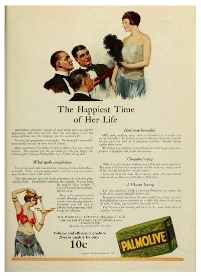 Palmolive Advertisement, Harper’s Bazaar, November 1920, vol. 55, no. 11, p. 112a. (Image published with permission of ProQuest LLC. Further reproduction is prohibited without permission. Image produced by ProQuest LLC as part of Harper’s Bazaar Archive. proquest.com).