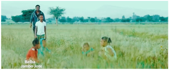 The soundtrack repeats all three melodies one more round, but the lyrics change. In the second round, Jambo Jote introduces new themes that deepen ideas raised in the first round. For example, in the second round, the song elaborates on secret stories of the protagonists as well as the problems that caused their separation. One also learns that the protagonists were childhood friends and lovers who grew up together playing games of ‘obstruction’ (where children mischievously tie grass on fields so that whoever crosses it would trip) in their village where he promises to take her back after they have reconciled (Figure 2). He suggests how their love deserves another chance, a new beginning. He sings about going back where they grew up, rediscovering their place of togetherness. However, one theme that recurs in both the first and the second round is making up and reconciliation by forgetting past differences—where the singer promises he will not bring them up, nor should she. They need to talk heart to heart to understand each other.