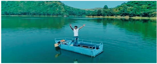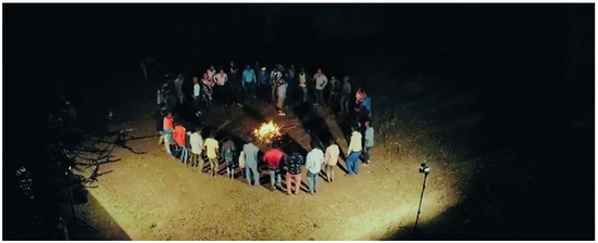 The music video Beelbaa is about homecoming. It tells the story of a couple who were separated by bad circumstances. The music video shows the return of a young man who had long left his childhood home to live elsewhere. It demonstrates the young man’s quest to be reunited with his protagonist wife and start life afresh. The video starts by showing the artist—Jambo Jote—standing on a canoe/boat on lake Hora-Arsadi. It then shows the life of the protagonist man and woman apart, the tiring journey he makes to reconnect with her, traveling a long distance by foot, alone (Figure 3 and Figure 4). The lyrics suggest that the couple have come a long way, overcoming painful years of separation. The trajectory of their life stories from a boy and a girl growing up in their ‘native homeland’—Bashaqqannaa—playing on the fields as childhood friends to lovers, buddies, partners, husband and wife, to individuals leading separate lives ‘as if they were foes’ is instructive about their resiliency during the assaults of time. Time and temporality (e.g., yeroo, barri) here have multiple meanings beyond the conventional ‘clock-time’. They denote occasions, happenings, or events that are historic, present, future, and cyclical. The lyrics explore change and transformation, using the metaphor of seasons—rain, sun, summer, winter, this time, yesteryears, etc. The passage of time is presented as an antidote to recovery from the traumas and loss borne in their untold story. Jambo Jote states how ‘times have now changed’, that the governance of life seems to have aligned with their ethos. He suggests the ‘end of the dark period’, and that ‘truth of light is on the horizon’, invoking a ‘hopeful future’. The emotional poignancy of these lyrics reaches across multiple themes—interweaving a messy mix of loss, separation, rupture, vulnerability, pain, connection, hope, and love. The lyrics connect change and history and how their present ‘fortunes’ call for gratitude and a reaffirmation of life as a powerful motivating force. Towards the end, the arrival of the young man at his home is shown, with people from the community celebrating around an evening bonfire, singing and dancing (Figure 5).