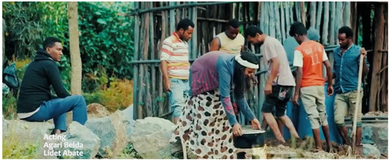 It is worth noting that the song came about at a moment in Ethiopia’s history when the language of ‘inclusive democracy’ and ‘opening up the political space’ took hold in the national discourse and when several exiled activists and opposition political parties—previously categorized as ‘terrorist groups’—returned home. The idea of ‘homecoming’, a theme in the song, is construed as the coming back of banished political parties, including the Oromo Liberation Front (OLF). In this sense, the story the song bears coalesce with the way politicians and citizens alike started to reimagine ‘what could be’ and ‘what is possible’ regarding the country’s politics and future. Furthermore, the music video shows how people construct a new hut in which the protagonist couple will reside. Men and women pull together labor and resources, mixing soil with grass and water to prepare a sticky mud and using it to plaster the wall of erect split wood (Figure 8). Building collectively could be understood as the project of nation-building, in which its inhabitants could be brought together as stakeholders. It lends interpretation on building a nation in ways that are not only inclusive but also appeal to and reflect the desired image of its population.