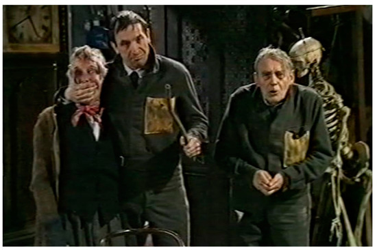 Episodes usually begin with a wide shot of the living room of the Steptoes’ home, as does The Desperate Hours (Figure 1), and this detailed domestic interior, open to a studio audience on one side, very much resembles a stage set like the one specified by Pinter for The Birthday Party. Nearest to the camera is a square wooden Victorian dining table, with four wooden chairs, while the back and sides of the set are crammed with items that we assume the scrap dealers have collected on their rounds over the years. Although the lighting is dim, the disorderly surroundings can be seen to include a human skeleton like those used by trainee doctors, a Victorian wind-up phonograph with a large trumpet loudspeaker, and stacked Victorian furniture in dark mahogany that reaches above head height. To the left, there is a large Victorian roll-top desk, strewn with items including a goldfish in its bowl and various papers. On the right-hand side of the set is a large wooden sideboard, with shelves on which are mounted a collection of bottles of liquor upturned into the dispensers used to measure out drinks in a bar. The setting shows the accumulation of objects over decades, even generations, and the palimpsestic layering of newer over older items without any sense of design or décor. The two men are surrounded by this encroaching debris, despite the generous size of the space, and it physically expresses their inability to change their circumstances or their relationship with each other.