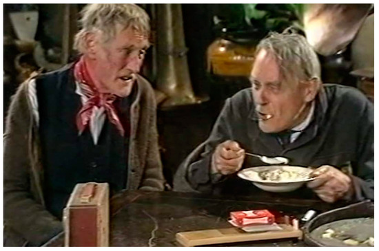 Johnny explains to Harold and Albert how his cellmate and companion Frank (J. G. Devlin) got caught on the barbed wire of the prison walls during their escape. In the robbery for which they were originally convicted, Frank could not get away because he had stuffed his pockets with bars of bullion from a bank vault. Frank always holds Johnny back, Johnny complains. Harold enthusiastically makes the parallel with his father Albert: “It’s just like him out there. He’s held me back all my life, he has.” Albert comes back into the room carrying the food demanded by the convicts, but it is only cold porridge from breakfast, some dry bread, and a piece of mouldy cheese, recalling the way distasteful food appears right from the beginning of The Birthday Party in the out-of-date milk on Petey’s cornflakes. Albert suggests, helpfully, “you can scrape the green bits off” to make the cheese edible, but Johnny is shocked. “We can’t eat this, it’s disgusting. There’d be a riot if they served that in prison.” While Johnny turns away in resignation and disgust, Frank tucks into the cold porridge and rebukes him: “Trouble with you is, you’ve got it too easy. I was brought up during the Depression. You ate what you could get.” Albert and Frank join in bemoaning the younger generation’s lack of appreciation for their elders (Figure 3). The four characters group around the table, in positions that pair them off with each other visually. The elders Albert and Frank find mutual solidarity against Harold and Johnny, who also share a resentment of the older companions with whom they are stuck.