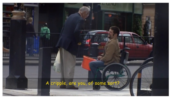 In one of his most famous pieces, Clark goes out to collect money for fake charities, each being more hideous than the last. Introducing the recording of this stunt to his live audiences, Clark explains that recently, he has received money from a stranger on the streets without asking for it. His personal account thereby mirrors that of several disabled activists, who openly criticize the media for providing limited images of visibly disabled people as either “beggar” or “Batman” and warn of the real-life implications these tropes frequently have (Radtke 2003). With this sketch, Clark challenges the trope of the disabled beggar and provides both the unaware passersby in London and his audiences across the UK an opportunity to reflect on their (potential) reactions to visibly disabled people. His stunt starts with him sitting on the sidewalk of a street, holding up a bucket that reads in bold letters: “PAY OFF MY MORTGAGE” (Clark 2011, 00:01:06). What follows are a number of interactions with people that give money to Clark despite him persisting that “no sir, you really don’t want to pay off my mortgage” (Clark 2011, 00:01:21). Throughout his live performances, Clark shows the recordings of various fake charity causes, briefly introducing each before playing the recording. He amplifies the humorous effect of his stunt by showing increasingly ludicrous causes which he received money for. In his second-to-last video, Clark is shown to hold up a bucket that reads “KILL THE PUPPIES!” (Clark 2011, 00:06:07), a cause that, as is shown, people are still willing to give him money for despite his warnings not to do so (see Figure 2). It is only in his final video that Clark fails to collect money. Providing a clever twist at the end of the performance, he shows his unsuccessful attempt at collecting money to “top up Heather Mills [sic] £24.3 million settlement” (Clark 2011, 00:07:59). With this final “charity case,” Clark does not only reference Mills’ much-discussed divorce from Paul McCartney but, by choosing the famous amputee model, he further counters the idea that disabled people are necessarily in need of financial support.