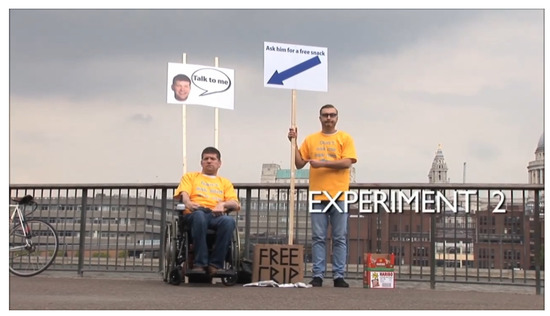 Over the last years, Clark has come up with a range of different so-called “experiments” that he records and uses for his live performances. In 2012, he subverted the idea of what disabled comedian and activist Stella Young has famously called “inspiration porn” (Young 2012, n.pag.) by stopping passersby on the street to tell them how inspiring they are to him. Among other things, Clark sits on the bottom of a set of stairs to congratulate everyone on their achievement of using the stairs: “How do you do that? That’s so inspiring” (Clark 2012b, 00:00:45). In yet another stunt, Clark gives away free snacks to people who personally address him on the street. But although he sets up big signs, instructing people to talk to him (see Figure 3), many passersby are shown to automatically walk up to his friend instead.