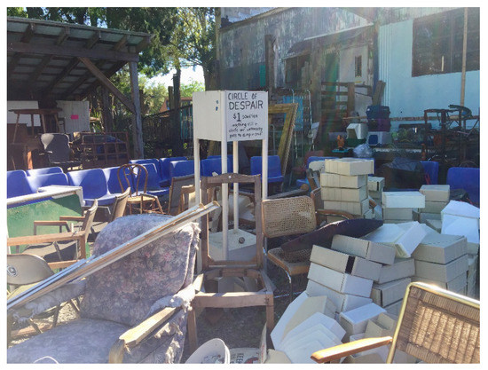 Marsha did a walkabout at Repurpose before the semester began to generate assignments for her students. The blurred boundaries between objects defied categories, so that even the indoor aisles veered between chaos and order like a modernist poem. Somewhere near a heap of fabric remnants and a bin of picture frames, Marsha saw an emblem of Frost’s woodpile in shelves of stacked furniture parts (Figure 4). Outside, she encountered The Circle of Despair, the salvage yard’s underworld (Figure 5). A place of last resort for unwanted objects, this open enclosure offered a week’s reprieve from the county dump. Marsha’s students would encounter such mergers of the mythic and the mundane in the city poems they read, including Eliot’s purgatorial London in The Waste Land. Like their walkabouts through Repurpose, students’ navigations through densely packed lines of images and allusions could prove disorienting.