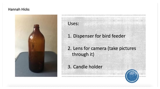 In her Modern American Poetry class, Marsha sent students to Repurpose for shopping and brainstorming. Their assignment: purchase an item for $2.00, photograph it, imagine three different uses for it, and make a slide to share with Charlie’s students. Literally shopping for images, Marsha’s students were alternative shoppers going against the grain of American consumer culture. Students hunted for things they could buy cheaply: a basket, a decorative tile, a door hinge, a lamp base, a windowpane, what one student termed mysterious papers. Wrenching these objects from their usual functions, Marsha’s students imagined new possibilities for putting them to use. A section of PVC pipe could be a blowgun. A table leg could roll dough, and a Rolodex file could hold burger patties. Thinking beyond candle holders, Hannah Hicks Brown saw a bottle as part of a bird feeder or a camera filter (Figure 6). These Repurposing slides were and were not like Surrealist renderings of objects, which sought to free them from functionality. The students’ repurposed objects were inventive, yet they remained grounded in everyday life. Even the strange set of paper circles covered with words and symbols could be repurposed: You could align their oval holes to make a camera obscura.