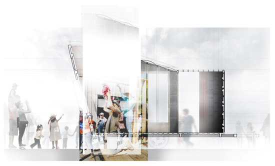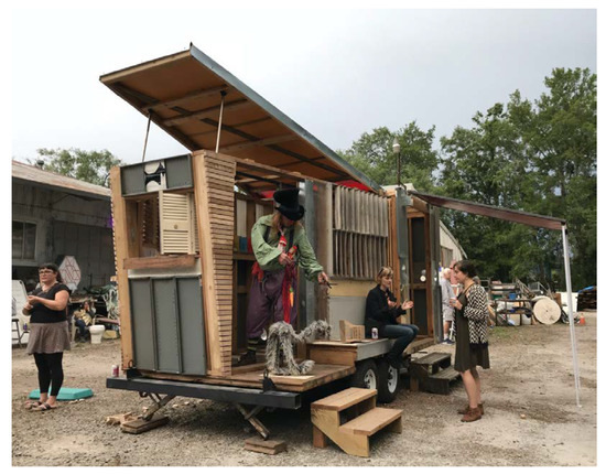 Architecture students McIntosh and Ryzhikova considered how one design response might serve multiple functions: “The trailer opens up from the top, reaching towards the sky, and letting in light. This highlights the puppet stage and provides an opening for the puppeteer’s ‘sky puppets.’ The form also allows for cross-ventilation.” They cited Stevens: “Let us build the building of light. / Put up the towers / To the cock-tops” to mark how poetic qualities (skywardness, verticality, and lightened performance) reposition a practical solution (ventilation). Stevens’s lines about “… the window sill / On which the quiet moonlight lies” recast the puppet stage’s opening as a portal to another world (Stevens 1923, p. 122). They also write how “[t]he puppet stage creates an imaginary space that acts as a ‘window’ to a world of creativity and learning…”—a window that exchanges actual and imagined worlds (McIntosh and Ryzhikova 2018).
