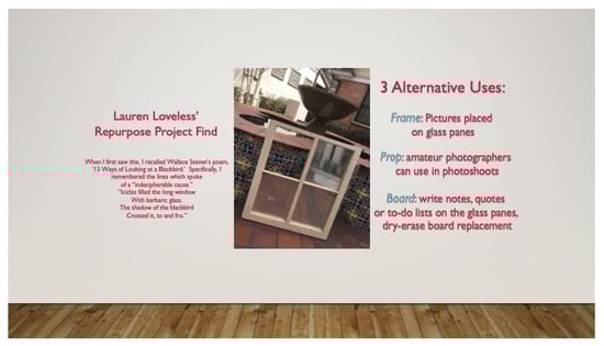 - Loveless, Lauren. 2018. Repurposing Slide and Maker-Space Poetry Project for Marsha Bryant’s Class, University of Florida. Unpublished work. [Google Scholar]
