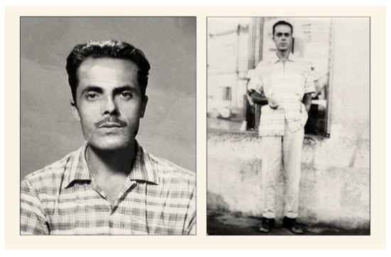 In essence, after multiple experiments of some works prior to Virtudes (e misterios), both Fraga and Ruido come to adhere to a narrative framework that subverts the most classic distinctions between the intimate and the public, the political and the personal, to show identities, affiliations and inheritances. An approach that they achieve using a great range of resources, which together create what Leonor Arfuch calls “biographical space”: interviews, chronicle, private diary, autobiography, biography, story, documentary research28. Means and techniques to which in the case of Ruido we can still add archive images, her own video recordings or fragments of theatrical pieces, among others29. A collage in which, however, what stands out the most is the use of the authors’ family albums, “un medio ampliamente disponible”30 that serves as a link with reality and invites “la empatía, la solidaridad y la responsabilidad hacia otros cercanos o distantes” (). The family photo album, although intimate, accounts for the universality of the theme because “nos vuelve susceptibles a percibir las conexiones entre historias y grupos divergentes”31 (). In this case, the emigrant as a foreigner, as an outcast and stateless, either in the host country or in the country of origin upon return. That is, the family photos achieve an emotional identification and show a commitment to those who are no longer there, because “the process of affiliative familial looking fosters and shapes the individual viewer’s relationship to this collective memory” (). Fraga and Ruido, putting all these elements into play, lead us through the migratory universe of parents and grandparents. Their vivid and intimate view of feelings and family relationships is perceived as transparent and honest, and allows the viewer/reader to adopt these memories as their own, since they are reflected in those experiences or they see their own parents and grandparents in those parents and grandparents, because “photographs in their enduring ‘umbilical’ connection to life are precisely the medium connecting first- and second-generation remembrance, memory and postmemory” (). Fraga’s grandfather’s suitcase is packed with the most curious objects, a leather case with glasses that are missing a lens, a Caravelle comb, Davis Menthol ointment, Clorets chewing gum, calendars from Lira’s butcher shop… They are old personal objects with no apparent relevance, but “memory’s duty is the duty of the descendants, and has two sides: remembrance and vigilance, to find the shape of the unnameable in the everyday” (). Objects, letters and photographs affirm the existence of the past and restore the presence of the absent. They are fragments with which Fraga creates a story, which, however, is impossible to reconstruct completely, there will always be mysteries. That is why it is logical to speak of a ‘poetics of ruins’ (), since the “fragmentos terrestres—islotes, masas rocosas, rompientes—parecen haberse diseminado sobre el mar de modo que hoy en día la mirada del profano no puede dejar de percibir un cierto parecido familiar pero tampoco puede reconstituir la coherencia perdida”32 (). The absolute veracity of past events or the temporal order in which they took place cannot be guaranteed. It is neither possible nor logical to do so, since the photos that once crossed the Atlantic in opposite directions now take on a significance of much more depth than the one they have as a document (Figure 1 and Figure 2).