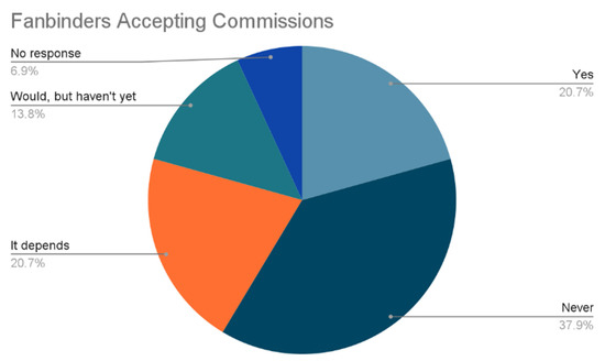 Approaches to fanbinding commissions offer insight into the role of compensation in fan craft and attitudes towards monetization in fan spaces. Of our thirty-one survey respondents, eleven said they do not take commissions, seven reported that it depends, four said they would but have not yet, seven said yes, and two did not respond to the question (Figure 1). Overall, approximately one-third of respondents said they were comfortable taking commissions in some manner, nearly equal to the number of respondents who did not take commissions at all. Where one might assume that those comfortable taking commissions automatically accept the role of monetization in fandom, their additional responses indicate a reticence to adopt any formalized for-profit model, such as those of Kindle Worlds and FanLib.
