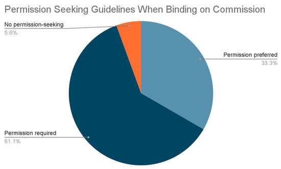 Out of the eighteen respondents for the author permissions section of the survey, fifteen respondents shifted their guidelines in favor of permission-seeking when potential commissions were introduced (Figure 2). One fanbinder elaborates, “I don’t feel like I need to ask permission to burn through money on behalf of someone’s work. But if I was PROFITING off their work, it would be a completely different story” (FB-1). Of those fifteen fanbinders, thirteen reported stricter guidelines regarding author permissions when binding on commission, with one arguing that “if money changes hands, permission is essential” (FB-11). Three of the binders retain the same guidelines for personal copies and commissioned projects, and one binder specifically does not ask permission for commissioned work. Overall, respondents felt it important to receive author permission when binding on commission with varying amounts of leeway in certain circumstances. For example, two fanbinders again noted orphaned works as a common exception to their permission-seeking guidelines, and others extended this exception to any project where the author was unreachable.