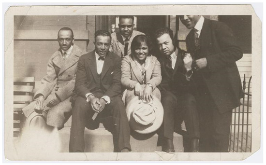 - Bennett with a group of friends. n.d. “Gwendolyn Bennett with a group of friends: Charley Boyd, Hoggie Payne, Jayfus Ward, ‘The Fat One’ Hoffman and ‘Bon Bon” Simmons’”, n.d. Schomburg Center for Research in Black Culture, Photographs and Prints Division, The New York Public Library. New York Public Library Digital Collections. Available online: https://digitalcollections.nypl.org/items/e970b1c0-967a-0131-026b-58d385a7bbd0 (accessed on 21 December 2021).