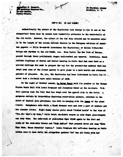 | 10 | Maureen Honey says Bennett “attended the 2 October 1925, première of La Révue Nègre on the Champs Élysée, where Josephine Baker wowed French crowds with her exotic dancing” (99–100). But Bennett writes to Harold Jackman on 27 October 1925 that she has not yet seen the “Revue Negre” and “shall be going in a day or two” (Bennett, Gwendolyn B., 5 autograph letters and 1 typed letter, signed, to Harold Jackman. Box 1|Folder 19. 1925–26. https://collections.library.yale.edu/catalog/16867529 (accessed on 1 March 2021)). Her article gives the date of 24 April 1926 as Baker’s “final coronation”, so it is possible that she saw Baker perform in late October 1925 and again in April 1926. |