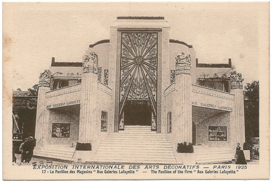 - Le Pavillon des Magasins “Aux Galeries Lafayette”. 1925. Postcard. Pavillon des Magasins “Aux Galleries Lafayette”. Exposition Internationale des Arts Decoratifs et Industriels Moderns. July 3. Public Domain. Available online: https://commons.wikimedia.org/wiki/File:Paris-FR-75-Expo_1925_Arts_d%C3%A9coratifs-pavillon_des_Galeries_Lafayette.jpg (accessed on 1 March 2021).