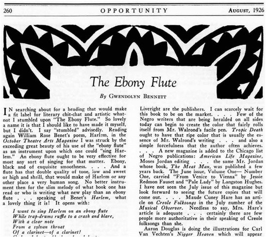 - Bennett, Gwendolyn. 1996. The Ebony Flute. In Opportunity: Journal of Negro Life. Monthly column, August 1926–May 1928; Reprinted in Wintz 1996. New York: National Urban League, pp. 104–37. [Google Scholar]