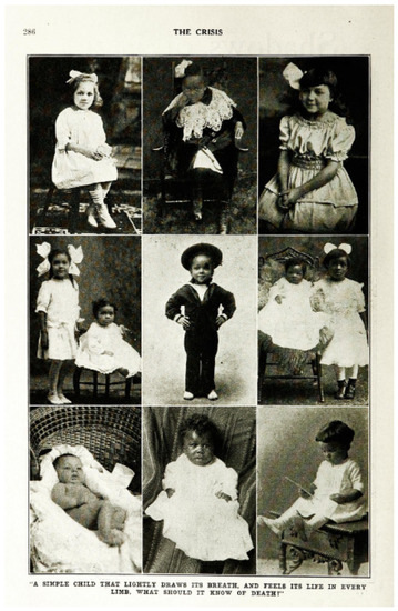 The Children’s Numbers most explicitly confront this racist visual vocabulary by drawing on the inherent collage aesthetic of the magazine form, placing images of posed Black children beside reports of lynchings, a rampantly racist criminal justice system, and other forms of racial prejudice and violence. Augusta Bird’s ironically titled story, “Race Purity,” which appeared in the 1918 Children’s Number, directly addresses the violence of the color line in particular. Framed by two photographs of children—a visibly Black boy and an ambiguously raced girl—the narrative unfolds in a hybrid style of newspaper reporting and short fiction worldbuilding, beginning “Out in the suburbs of the southern town of C—, in front of a low frame house, two children played upon the curb” (Bird 1918, p. 275) (Figure 6). The girl, Annie, threatens the boy, Jimmy, with a worm she has discovered on the ground. The story confronts both the racial grammar of images and the literary convention of Black dialect by depicting Annie as a “little flaxen haired girl” and racializing Jimmy through his speech—“if yo’ put that wo’m on me I’ll smack yo’,” he says (ibid.). The girl throws the worm at the boy, who follows through with his threat: “[h]e wheeled suddenly around and struck the child a full blow on the cheek” (ibid.). A white man “interfere[s],” hitting Jimmy “fiercely” and berating him with a racial slur before redressing Annie “in a softer tone” for playing with a Black child (ibid.). The story concludes with “the startled little girl” telling the man “through her tears” that the boy is indeed her brother (ibid.). This story draws upon “the innocent, vulnerable, sentimental child, a counter to the racist image of the pickaninny” even before the white man appears, as the children, in distinctively infantile ways, cause each other pain (Taylor 2020, p. 739). However, this version of childhood pain—portrayed as the innocent and ultimately harmless pain that accompanies socialization—stands in stark contrast to the pain that the white man imposes by wielding the color line as a socially divisive tool, one that divides him from them but one that also categorizes and separates the two children from each other based on their phenotypic appearances. The images that accompany this story also address the quandary of racial categorization by subverting “the truth and legibility of the photographic image” in demonstrating “racial difference” (Taylor 2020, p. 746). The photographs that frame “Race Purity” feature two children staring blankly into the camera; the feminine child has an ambiguous grin, and the male child looks straight ahead with mouth slightly open and head tilted to one side. The photos are cropped to show only the heads and shoulders of the children, centralizing their facial expressions as they gaze with unclear attitudes into the camera. The affect of these children is, in Taylor’s words, “malleable,” suggesting “the potentiality of the child’s body as a means of imagining a performative racial identity in which binary categorizations are destabilized” (Taylor 2020, p. 770). Further troubling the indexicality of these photos are the proportions of the children’s heads relative to each other and to the frames of the images: the girl appears to have been photographed at a closer angle, and consequently, her head appears larger than the boy’s, mirroring the story’s moral that appearances can be deceiving. That the story never flinches from describing the pain that the children endure and that so few of the images in The Crisis do visibly depict such pain attests to the differing dimensions of the magazine’s visual and discursive rhetorics and the ends that the editors of the magazine felt these different forms could achieve.
