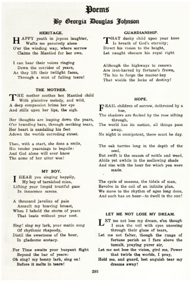 Georgia Douglas Johnson’s six poems featured in the 1917 edition of The Crisis’s Children’s Numbers. (The Crisis 1917, 14.6, p. 293), The Modernist Journals Project, https://modjourn.org/issue/bdr510854/, (accessed on 17 January 2022).