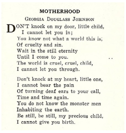 Johnson’s erotic poems confront the sexual lacuna of modernity, Blackness, and femininity—namely the presumed licentiousness of Black women—and attempt to represent Black women’s sexuality while retaining the dignity that middle-class standards demand. Tate (1997) writes that Johnson encoded sexual desire and sensual pleasure-taking “behind the demeanor of ‘the lady poet’” (p. xviii). Motherhood offers a particularly potent but also dangerous site in this stratagem, as “proper” motherhood could certainly obtain for Johnson the dignity of “ladyhood,” while any errant eroticism or deviation from the heteronormative standard of childbearing would be fastidiously redressed. And yet, it is in her depiction of motherhood that Johnson is most willing to provoke. Perhaps the clearest example of the connection between Black women’s sexuality and Black motherhood in Johnson’s poetry is “Black Woman,” a poem in which a speaker addresses her unborn child, begging the child not to be born. Using the metaphor of the mother’s body as a door, the poem depicts a would-be Black mother who fears giving birth lest she expose her child to the racist world: