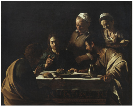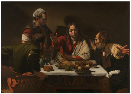 Michelangelo Merisi da Caravaggio’s Supper at Emmaus of (Caravaggio 1601). The National Gallery, London online, https://www.nationalgallery.org.uk/paintings/michelangelo-merisi-da-caravaggio-the-supper-at-emmaus, (accessed on 31 May 2022).