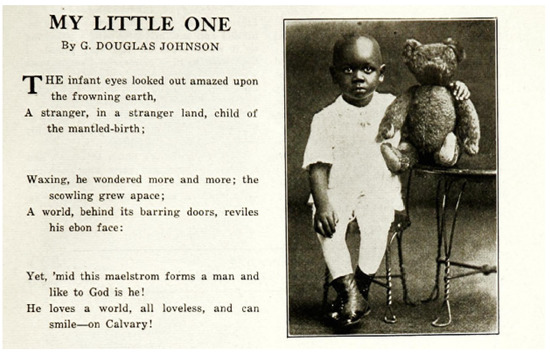 Johnson’s “My Little One” from the 1916 Children’s Number beside a photograph of a child with a teddy bear, a photo most likely submitted by the child’s mother. The Crisis 12.6, p. 273, The Modernist Journals Project, https://modjourn.org/issue/bdr510140/, (accessed on 4 December 2018).