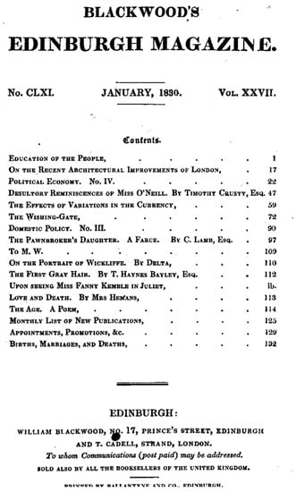 Blackwood’s Table of Contents. Available online: https://archive.org/details/sim_blackwoods-magazine_1830-01_27_161 (accessed on 18 August 2022). Public domain.