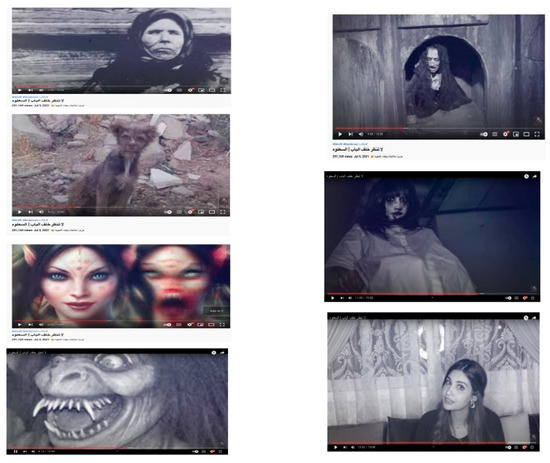 Throughout her YouTube channel content, @Ranoy7 tells us that she draws on the amateur aesthetic of lost-footage horror to signal the unreliability of technology, as well as the fantastical authenticity of female knowledge, folklore and post-truth stories. In the episode Don’t Peek Behind the Door: The Sa’lawwa (succubus) (Figure 1), @Ranoy7 (shown in the last frame of Figure 1) addresses her predominantly teenage female audience directly and fosters close parasocial relations typical of social media influencers (Hurley 2019). Following these subtle parasocial formalities, as calibrations of engagement, @Ranoy7 promotes a series of products and brands to her young female audience and encourages them to buy products while consuming her narratives. The following excerpt from her video story, which streamed on 3 July 2021 (Figure 1), begins without audio. This helps to focus attention on @Ranoy7’s face as she applies the makeup brand of the paying sponsors of the scary story episode. @Ranoy7 tells her teenage audience in Arabic: