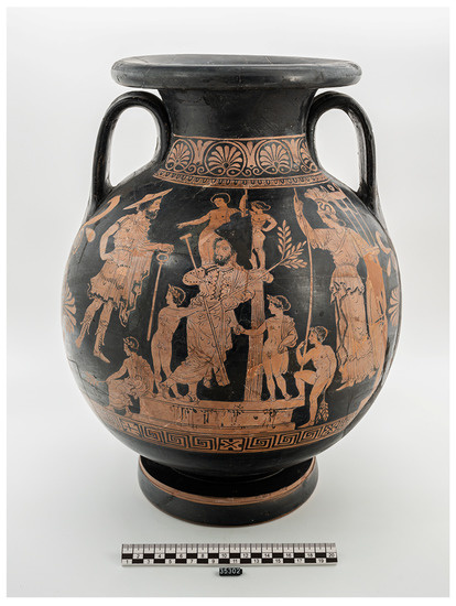 By continually making reference to the protective altars and statues surrounding them, the Suppliant Women’s chorus animates the divine beings and compels them into guardianship of the refuge seekers. While no ancient images depicting episodes from the Suppliant Women have been recognised to date (Taplin 2007, p. 146), illustrations of other such moments do survive. The most analogous is a scene on a red-figure Lucanian pelike of circa 400 BCE, from South Italy (Figure 3). The composition illustrates an episode from the myth of Herakles’ children in flight from the Argive king Eurystheus, which is the subject of Euripides’ tragedy Herakleidai.28If you don’t make a promise to our band that we can rely on—…With all speed… [we will] hang ourselves from these gods.…You understand! I have opened your eyes to see more clearly.(Aeschylus, Suppliant Women, lines 461, 465, 467)