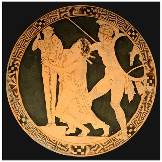 Cassandra abducted by Ajax the lesser. Tondo of an Attic red-figure cup, ca. 440–430 BCE. Louvre, Paris, France. Accession Number: Louvre G 458. (Public Domain. Image File Link: https://commons.wikimedia.org/wiki/File:Aias_Kassandra_Louvre_G458.jpg accessed date: 2 January 2023).