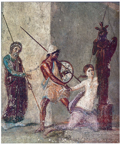 Cassandra abducted by Ajax the lesser with her father, Priam. Section of a wall painting, 1st century CE, from the House of Menander (I, 10, 4), Pompeii, Italy. Image Source: Ranieri Panetta (2005, p. 349). (Public Domain. Image File Link: https://commons.wikimedia.org/wiki/File:Pompeii_-_Casa_del_Menandro_-_Menelaos.jpg accessed date: 2 January 2023).