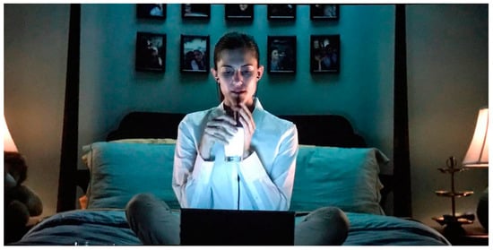 Rose is the vampiric Whiteness at the heart of Get Out, and Peele closely scrutinizes and inverts her White feminine identity. She confounds audience expectations that she would join Chris in his escape and be the “Final Girl” who survives a horror movie’s violence. As David Greven succinctly puts it, “Rose is the non-Final Girl in that she does not slay the monster but is the monster” (Greven 2021, p. 201). Rose’s role is to lure Black boyfriends and girlfriends to the family home so they can be transplanted. Once this role has ended with Chris, her physical appearance drastically changes. Unaware that Chris is starting to escape, she sits on her bed, hair pulled away from her face, wearing masculine clothing, snacking on dry Froot Loops cereal, and drinking from a separate glass of milk—a common White supremacist taunt against lactose-intolerant Asian populations (Figure 1). Serendipitously, her outfit of a button-down white shirt and beige chinos matches the apparel of young White men at right-wing rallies such as Unite the Right in Charlottesville, which took place six months after the film’s release. In “this beautiful, psychotic image”, Rose is defeminized and desexualized; she is no longer the cool carefree progressive woman Chris knows but instead a reactionary adolescent in “stunted animation”, Peele qtd in (Yamato 2017; Peele 2019, p. 181 n. 3). She sits on her childhood bed, her feminine features replaced with a gaunt skeletal face as she searches online for young Black athletes.