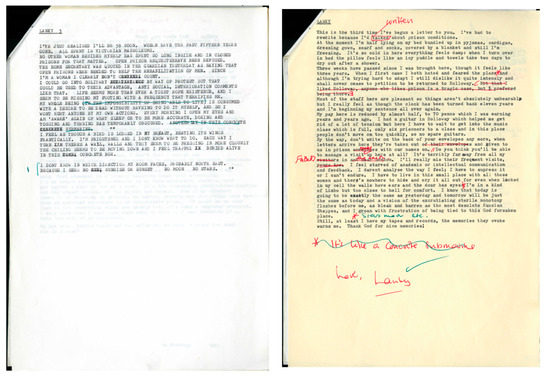The Clean Break archive holds the original drafts of the ‘Lanky Letters’ (Figure 2), and these are particularly interesting as we can observe the cuts made for Women of Durham Jail. In Lanky’s case, a great deal of text was lost; the original letters hold multiple reflections on the act of letter writing, and these form a substantial part of what was removed for the final cut. The form of the letters reveals one aspect of the epistolary as a chameleonic, porous host of many kinds of writing and technologies of writing: note how Lanky 3 above, with its all capitals, carries the urgency of a telegram. The unnumbered Lanky to the right carries a strong styling as a ‘letter’ in the way that its editor signs off ‘Love, Lanky’ in her own handwriting. There is a live correspondence between the two versions, at least two rounds or two editors (or both), in red and green ink, checking over the text and largely focused on recalibrating metaphors and images. The ‘concrete submarine’ moves from Lanky 3 to Lanky, and is then ultimately rejected—(it does finally dock in the BBC programme). Meanwhile, the cell as ‘Russian Steppes’ in Lanky attracts the text from Lanky 3: ‘I don’t know in which direction my room faces, probably North East. Because I see no sunrise or sunset No moon No stars’. These images both indicate troubled navigation—deep sea submersion, moving coordinates, no coordinates due to the lack of stars—and give a sense of the vast address-less expanse from which letters are sent. Any envelopes that will give the address, as Lanky notes in paragraph six, are removed. A beautifully performative edit—‘By the way, don’t write on the back of your envelopes any more, when letters arrive here they’re taken out of their envelopes’—is also mysterious. How does Lanky know that her interlocutor ever wrote on the envelopes, if she never receives them? This suggests an extended collective of prison staff or others, perhaps, sharing this information with Lanky. It is also an instruction to those watching the BBC programme then and now: language that bleeds out of the container will not be received on the terms intended by the sender.