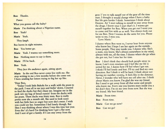 Letters in Yard Gal remind us of the count of time, too, where we have previously been drawn into blitzes of action. Marie and Boo’s sensory-led language complicates quantitative ways of experiencing time: as their world bangs into a wall, feeling the pain and alienation through epistolary form stands in stark contrast to the intoxication of the narrative. These letters as letter cloths are intensely spatialising—Marie and Boo’s environment has become dissonant where it was consonant. In his work on narrative duration, Feeling Time, Amit Yahav writes of epistolary novels as ‘restor[ing] us to an inabstractable duration—you must twine your duration with them, for a summary would just miss the point … restoring to actions their durations, [makes] any moment tied more strongly to the full process of which it partakes’ (Yahav 2018, pp. 25–26). In Yard Gal, the summary action imparted through monologuing in Act Two sets up the letter to once again twine the audience into ‘inabstractable duration’ of carceral spatiotemporalities.